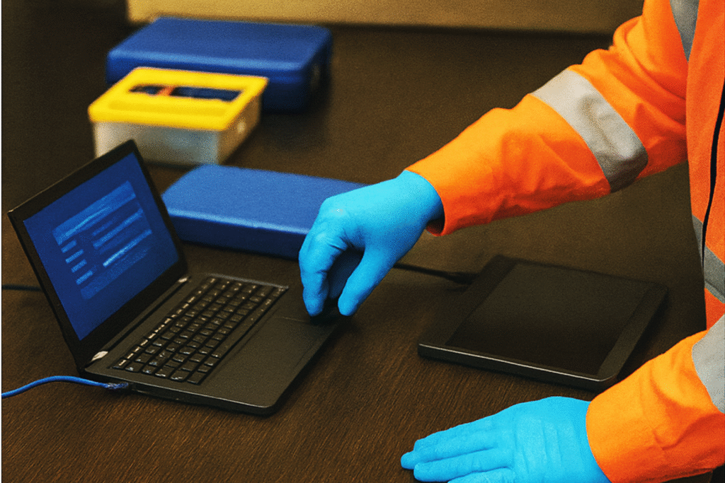 1. Arrivée sur site client et identification des appareils : nos équipes identifient les supports à effacer et vérifient leur traçabilité avant toute intervention.